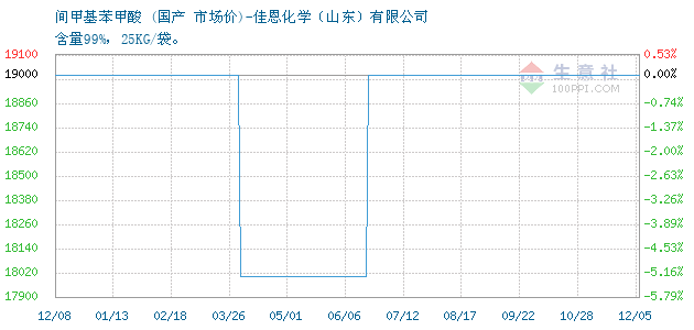10月12日国产关于间甲基苯甲酸的报价为19000元/吨。间甲基苯甲酸的规格:含量99%,25KG/袋。。该报价有效期为3天。报价提供方:佳恩化学(山东)有限公司。