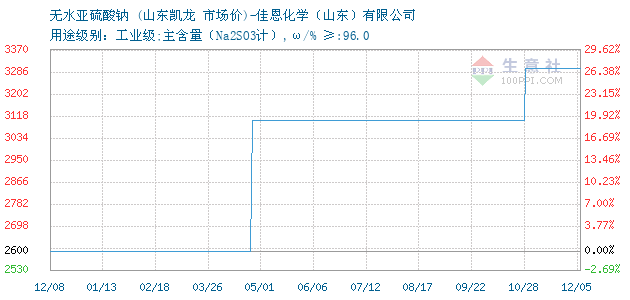 10月12日山东凯龙化工科技发展有限公司关于无水亚硫酸钠的报价为3100元/吨。无水亚硫酸钠的规格:用途级别:工业级;主含量(Na2SO3计),ω/% ≥:96.0。该报价有效期为3天。报价提供方:佳恩化学(山东)有限公司。