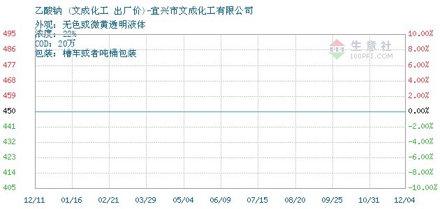 01月12日文成化工关于乙酸钠的报价为450元/吨。乙酸钠的规格:外观:无色或微黄透明液体浓度:22%COD:20万包装:槽车或者吨桶包装。该报价有效期为3天。报价提供方:宜兴市文成化工有限公司。